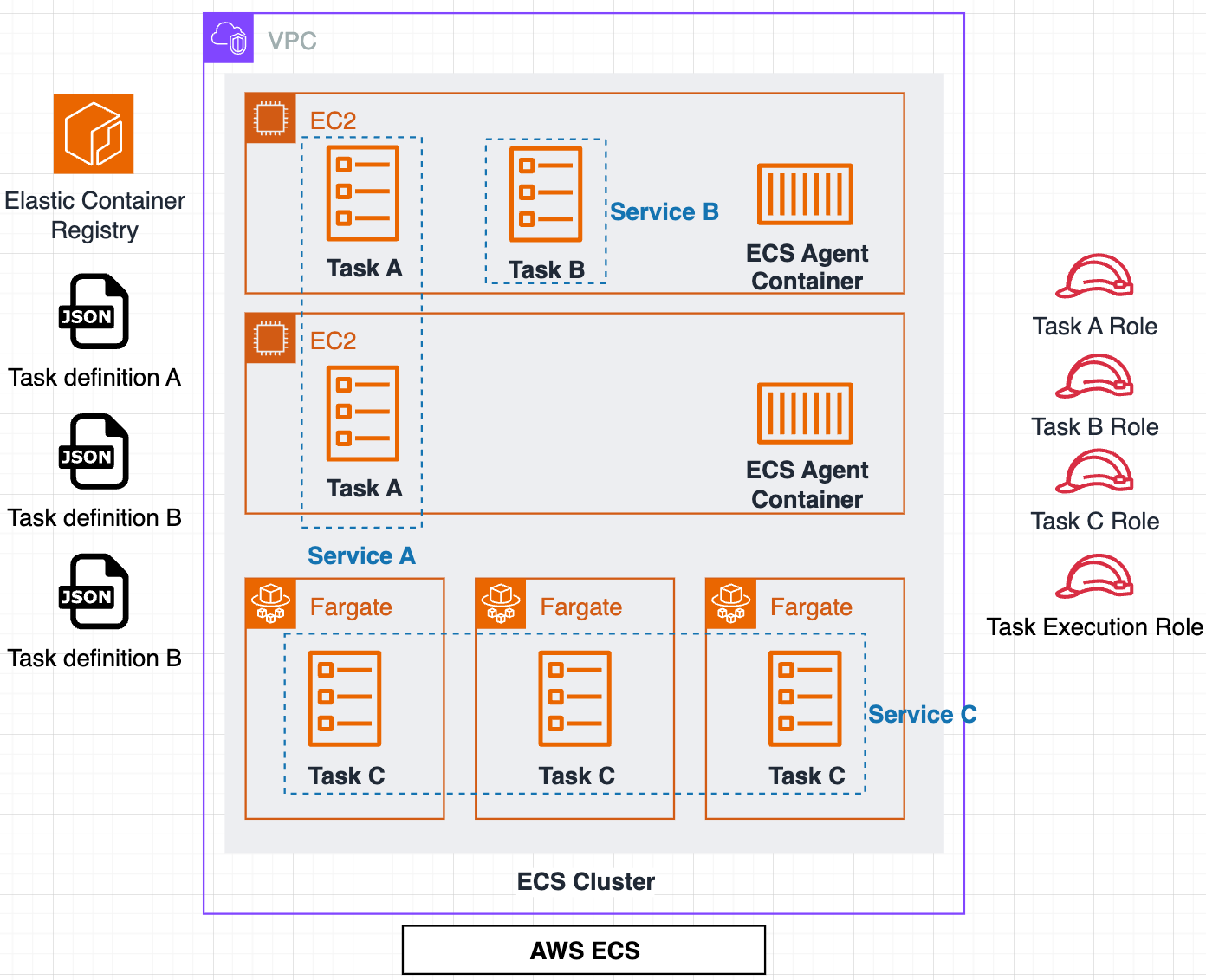 - ECS๋ Task, Task definition, Serivce, Cluster๋ก ๊ตฌ์ฑ๋ฉ๋๋ค.