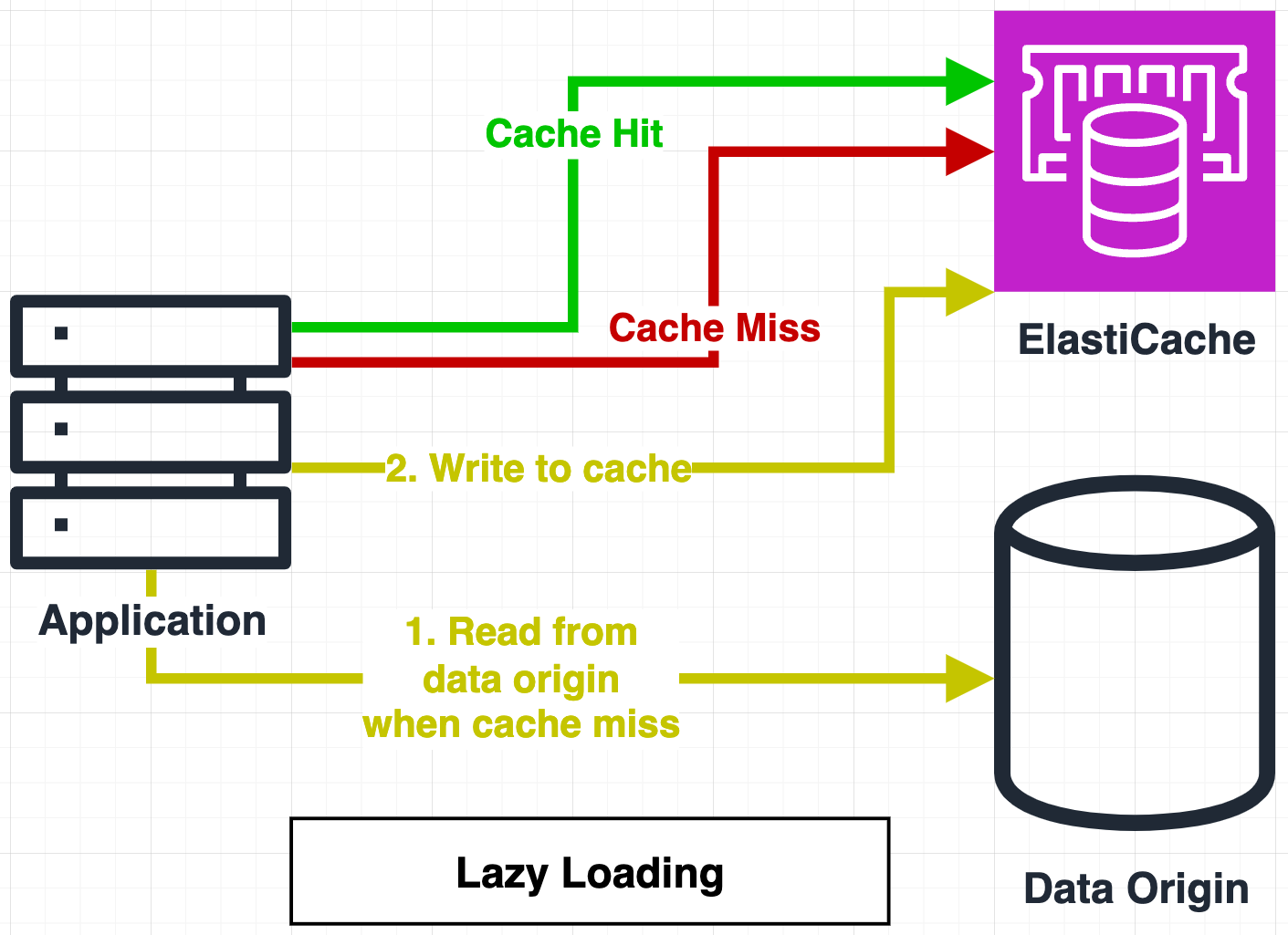 - Lazy caching์ ์ํ๋ ๋ฐ์ดํฐ๊ฐ ์บ์์ ์๋์ง ํ์ธํ๊ณ ๋ฐ์ดํฐ๊ฐ ์๋ค๋ฉด origin์ ์ฟผ๋ฆฌํ์ฌ ๋ฐ์ดํฐ๋ฅผ ํ์ธํ๊ณ ์บ์์ ์ ์ฅํ๋ ๋ฐฉ์์ ๋๋ค.