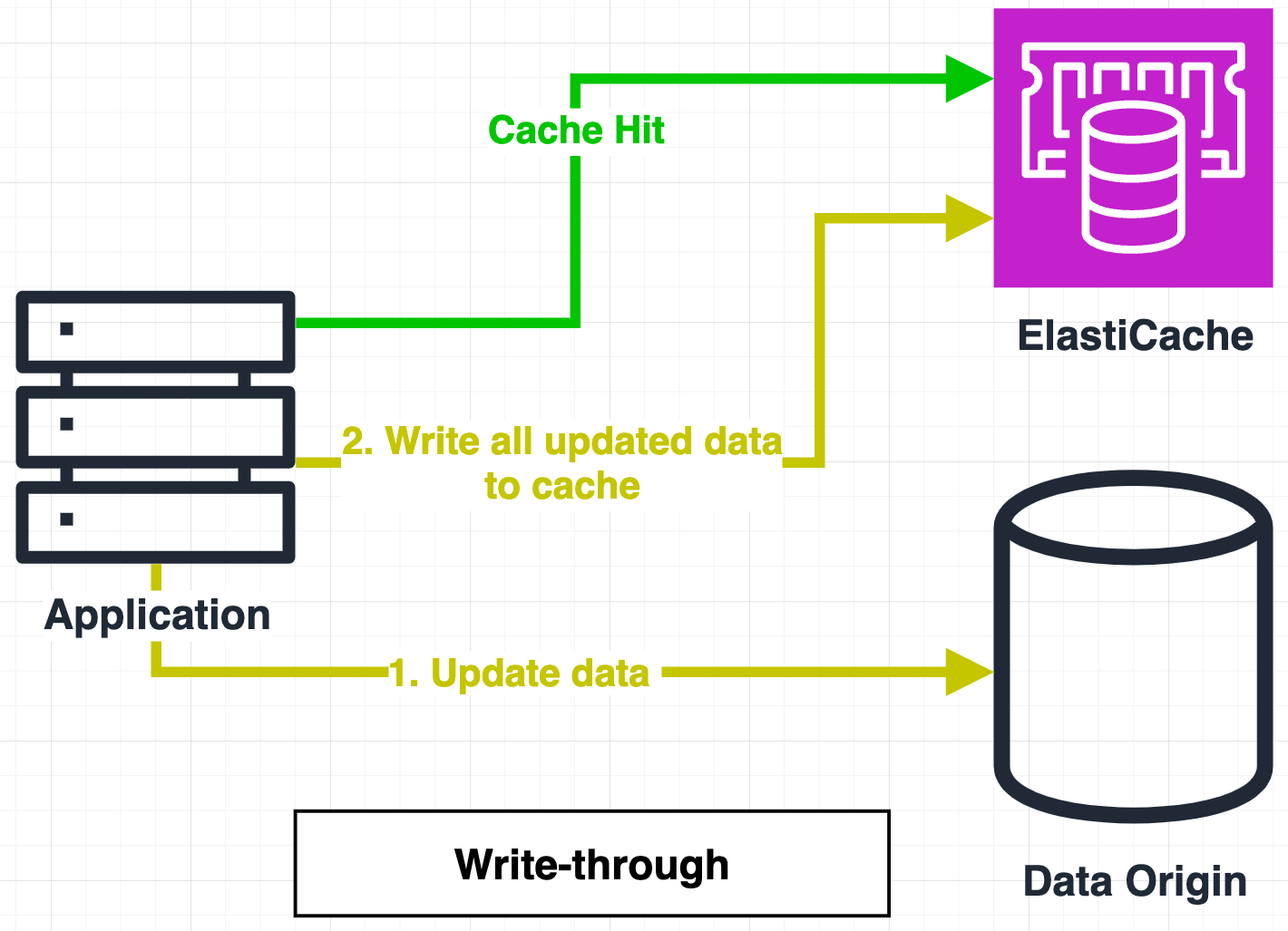 - Write-through๋ origin์ ๋ฐ์ดํฐ๊ฐ ์ ๋ฐ์ดํธ๋ ๋ ์ค์๊ฐ์ผ๋ก ์บ์๋ฅผ ์ ๋ฐ์ดํธํ๋ ์ ๋ต์ ๋๋ค.