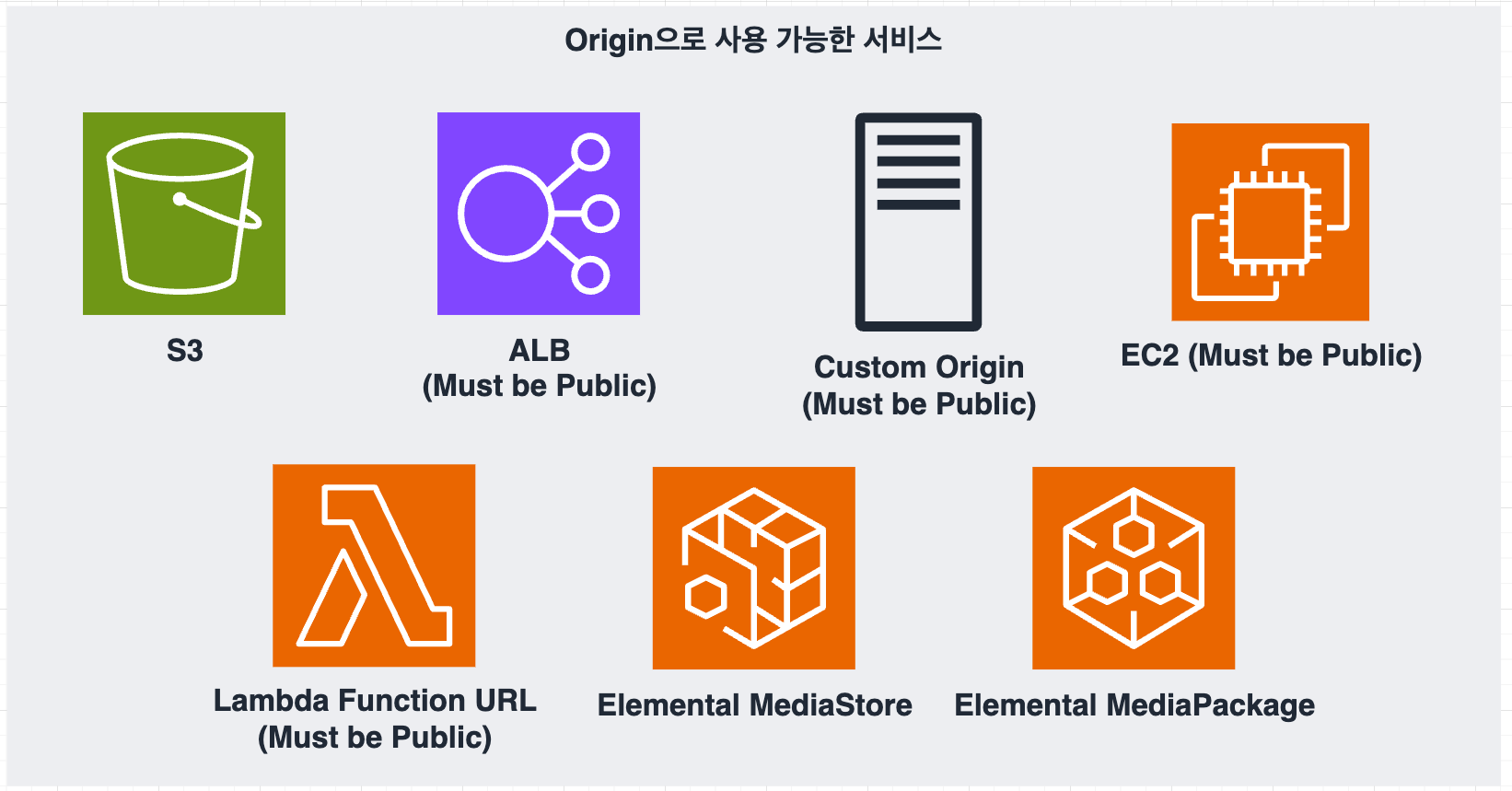 - Origin์ S3, ALB, Lambda function URL, EC2, Custom Origin(HTTP), MediaSotre, MediaPackage๊ฐ ๊ฐ๋ฅํฉ๋๋ค.