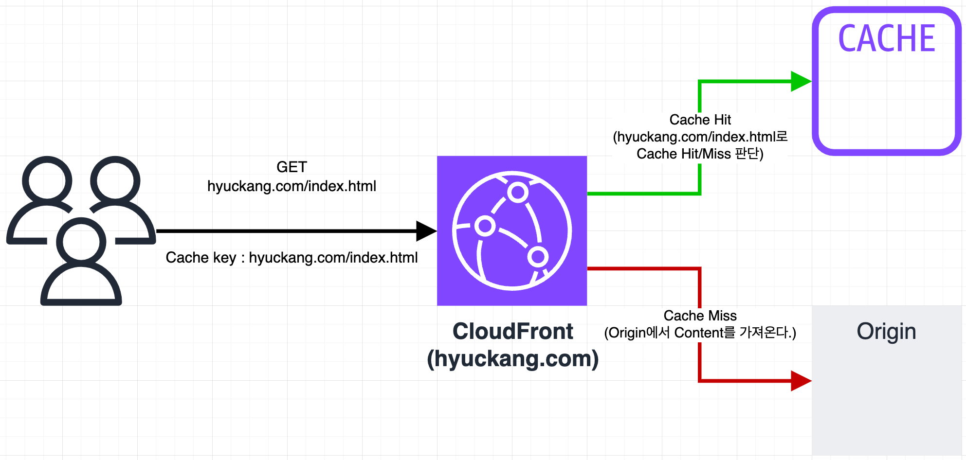 - Default cache key๋ CloudFront distribution์ domain name๊ณผ ์์ฒญ URL ๊ฒฝ๋ก๋ก ๊ตฌ์ฑ๋ฉ๋๋ค.