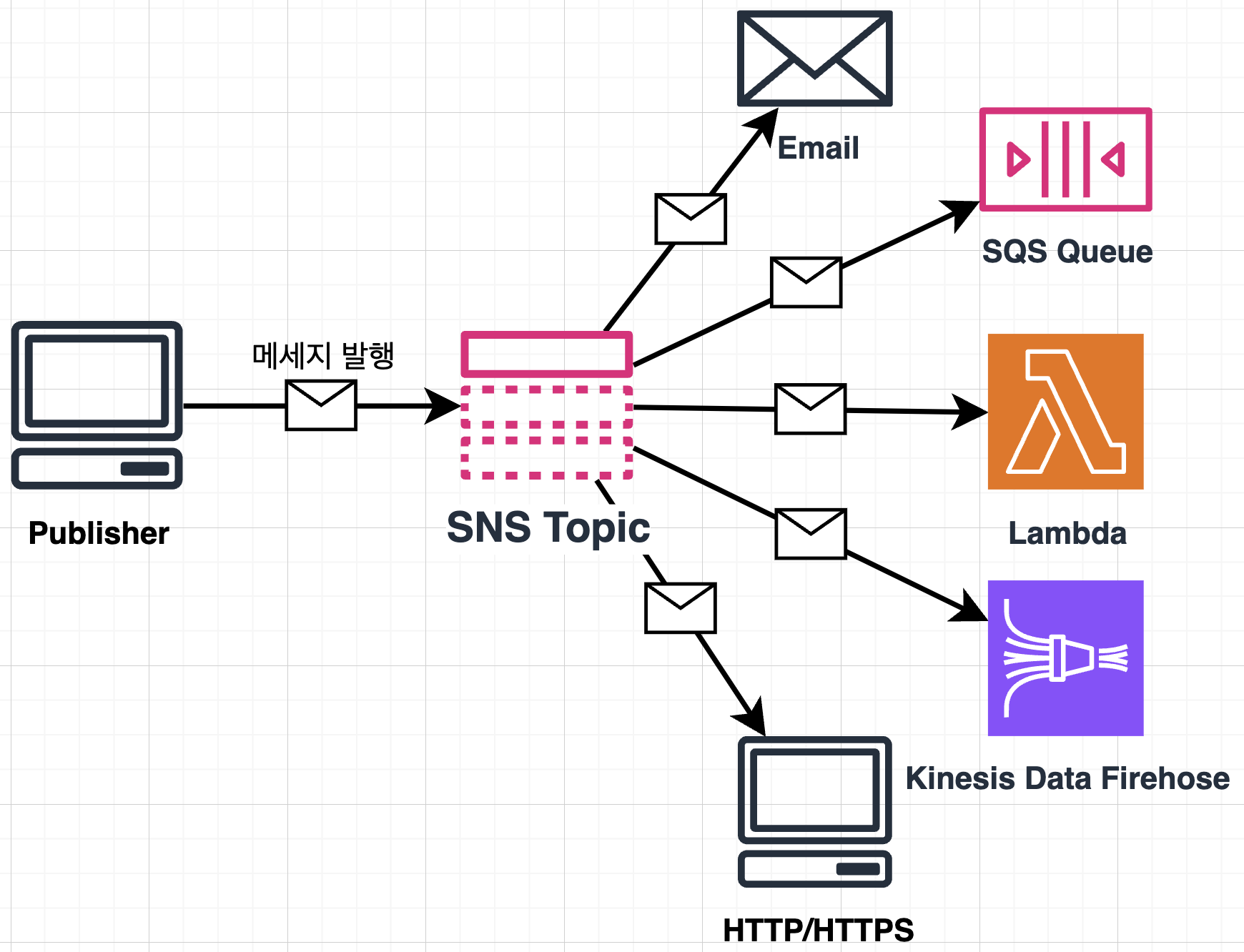 - ๊ตฌ๋ ์๋ SNS Topic์ ๊ตฌ๋ ํ๊ณ Data Firehose, SQS, Lambda, HTTP, email, SMS์ ๊ฐ์ ์๋ํฌ์ธํธ๋ก ๋ฉ์์ง๋ฅผ ์์ ํ ์ ์์ต๋๋ค.