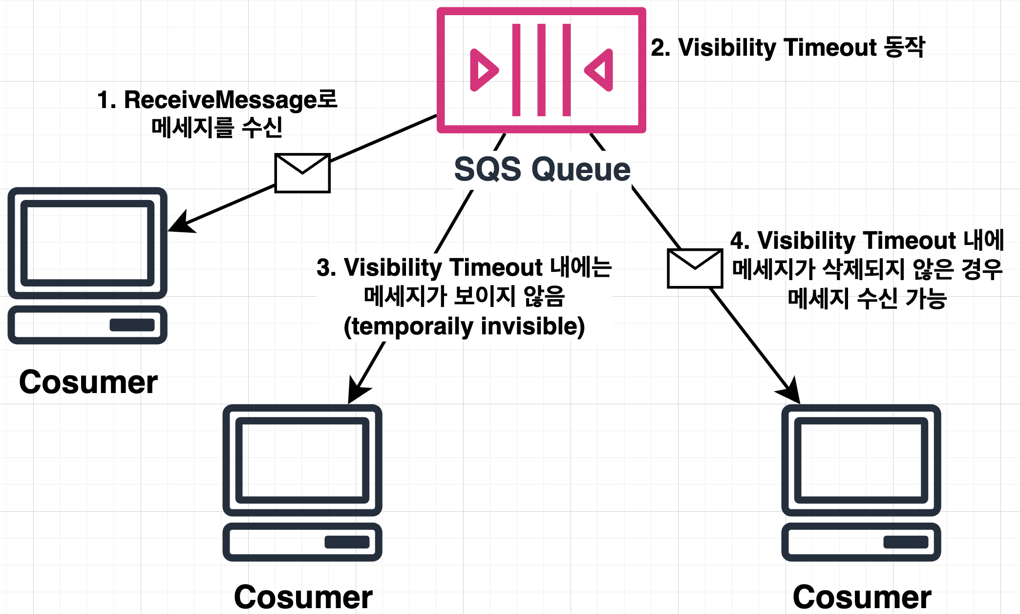- ์๋น์์๊ฒ ์ ๋ฌ๋ ๋ฉ์์ง๋ ์ฆ์ ํ์์ ์ญ์ ๋์ง ์๊ณ , Visibility Timeout ๋์ ๋ค๋ฅธ ์๋น์์๊ฒ ๋ณด์ด์ง ์๊ฒ ๋ฉ๋๋ค.