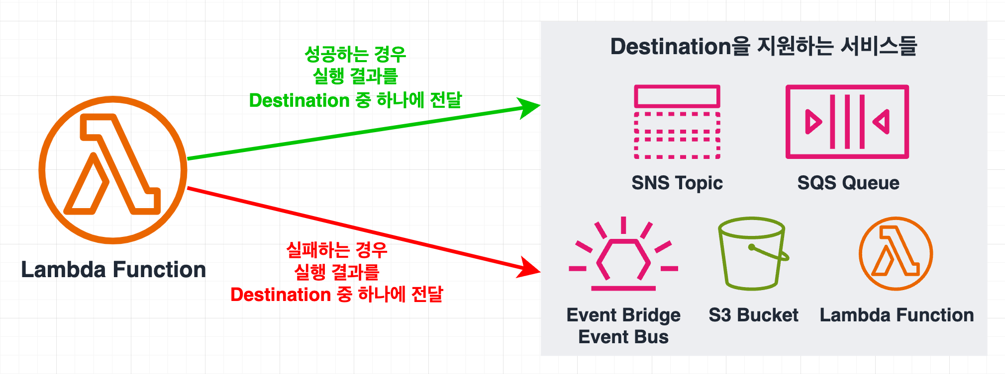 - 비동기 호출의 경우 성공한 결과(on-success)와 실패한 실행 결과(on-failure)를 Destination으로 보낼 수 있고, 이벤트 소스 매핑의 경우 실패한 실행 결과만 Destination으로 보낼 수 있습니다.