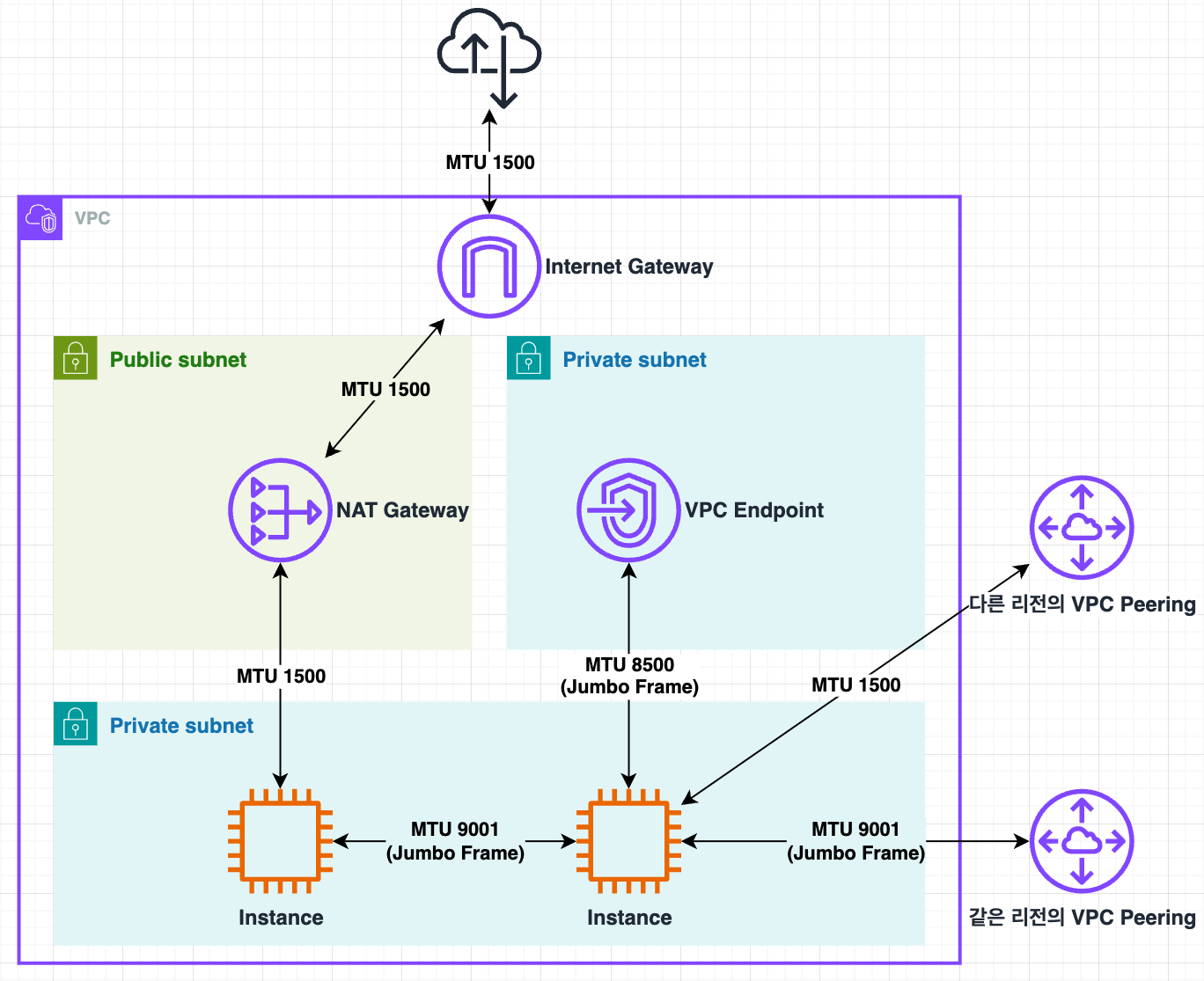๋คํธ์ํฌ ๊ฒฝ๋ก์์ Jumbo Frame์ ์ง์ํ์ง ์๋ ์ฅ๋น๊ฐ ์๋ค๋ฉด Jumbo Frame์ ๋จํธํ๋์ด ํธ๋ํฝ์ด ๋๋ ค์ง ์ ์์ต๋๋ค. - Path MTU๋ ์ถ๋ฐ์ง์์ ๋ชฉ์ ์ง๊น์ง์ ๋คํธ์ํฌ ๊ฒฝ๋ก์์ ์ง์๋๋ ์ต๋ ํจํท ์ฌ์ด์ฆ์ ๋๋ค.