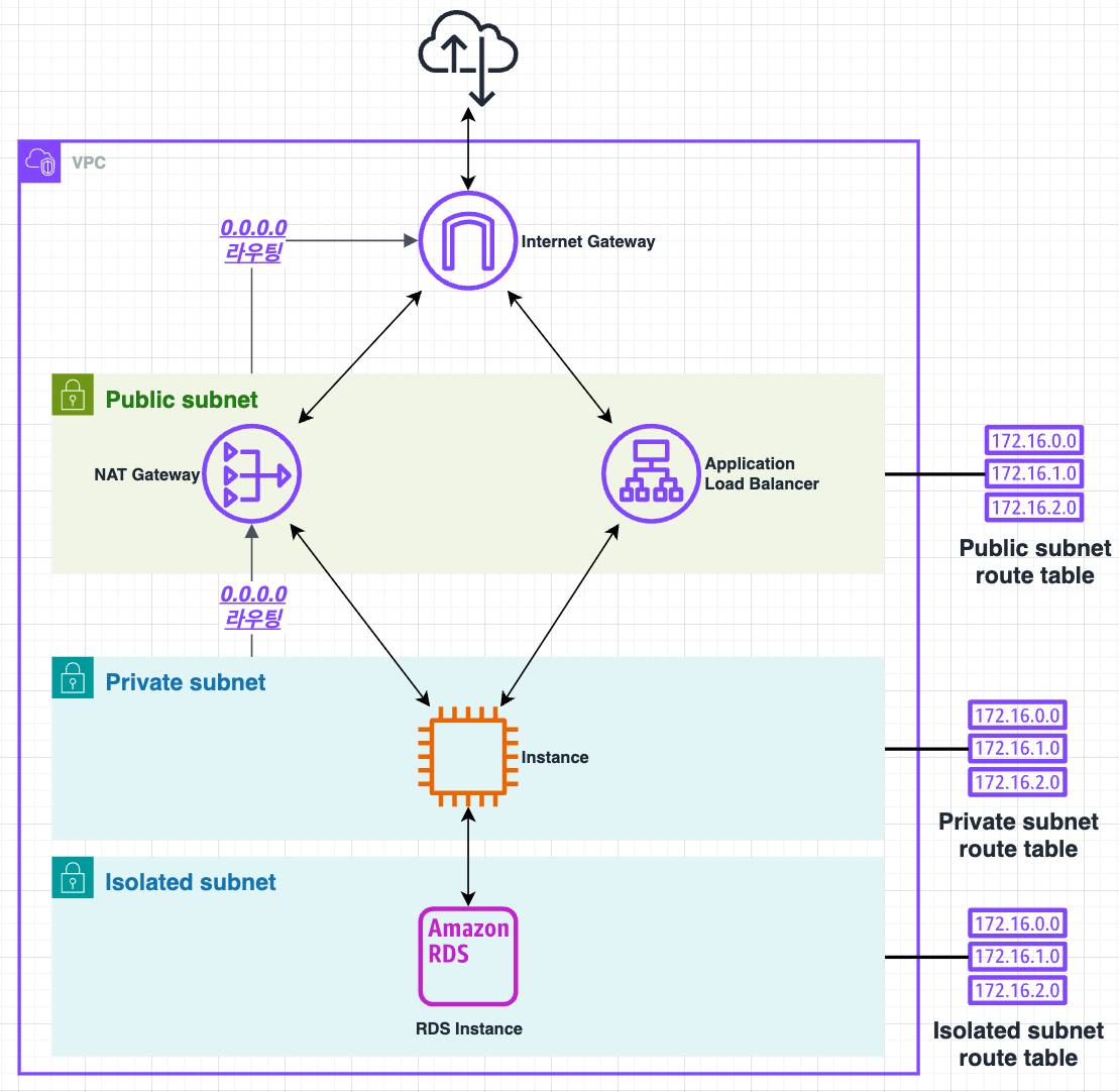 - Isolated subnet์ VPC ์ธ๋ถ๋ก ๊ฐ๋ ๊ฒฝ๋ก๊ฐ ์์ต๋๋ค. Isolated subnet์ ๋ฆฌ์์ค๋ ๋์ผํ VPC์ ๋ค๋ฅธ ๋ฆฌ์์ค์๋ง ์ก์ธ์คํ ์ ์์ต๋๋ค.