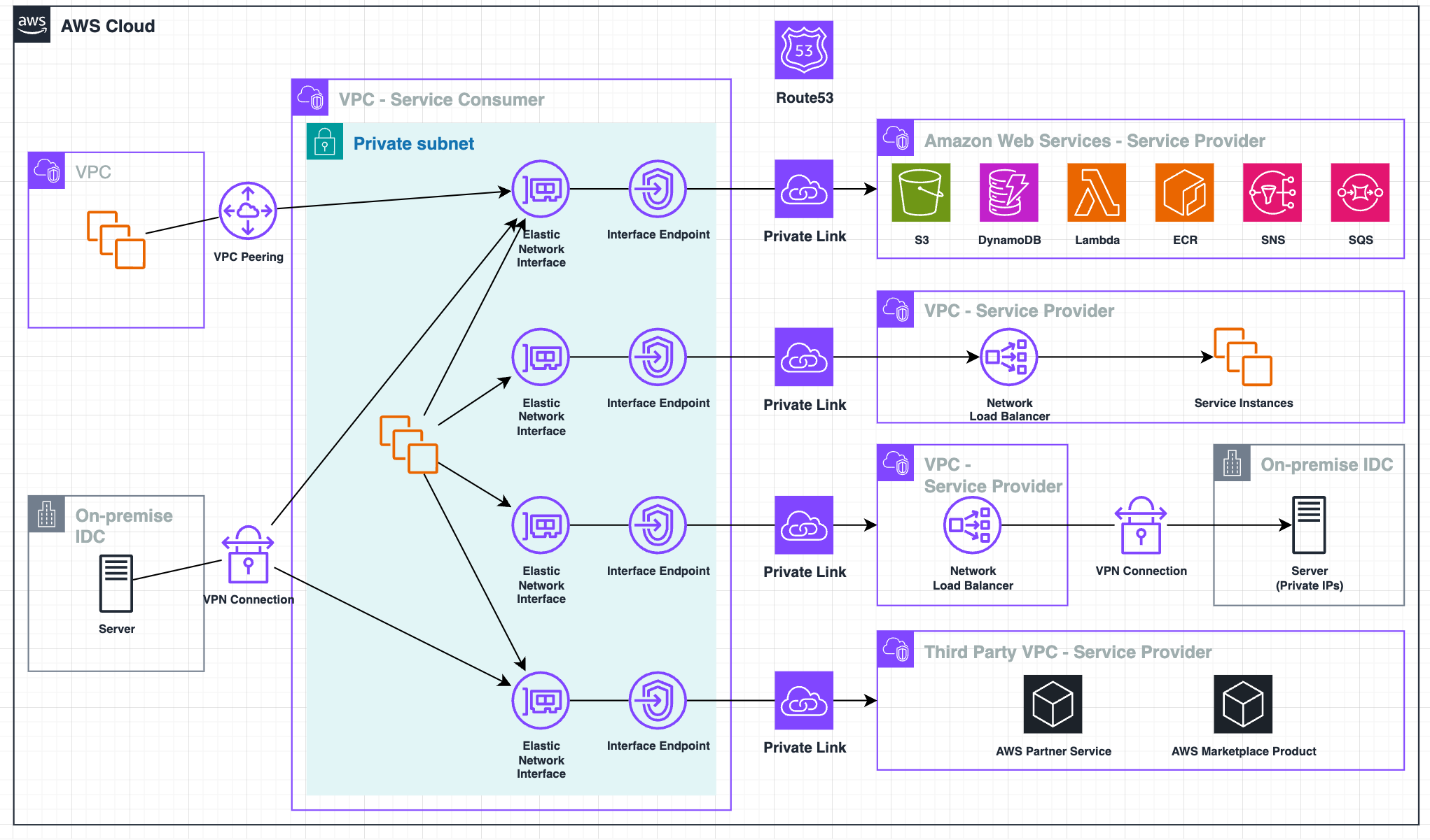 - PrivateLink를 통해 전달되는 트래픽은 Amazon 네트워크를 벗어나지 않습니다.