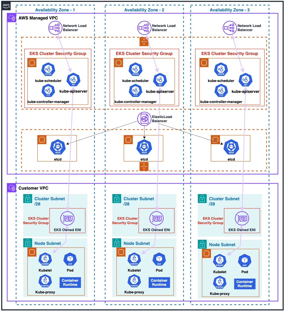 - EKS Cluster Endpoint는 NLB(Network Load Balancer)로 구현되어, 각 Control Plane Node의 kube-apiserver로 트래픽을 분산합니다.