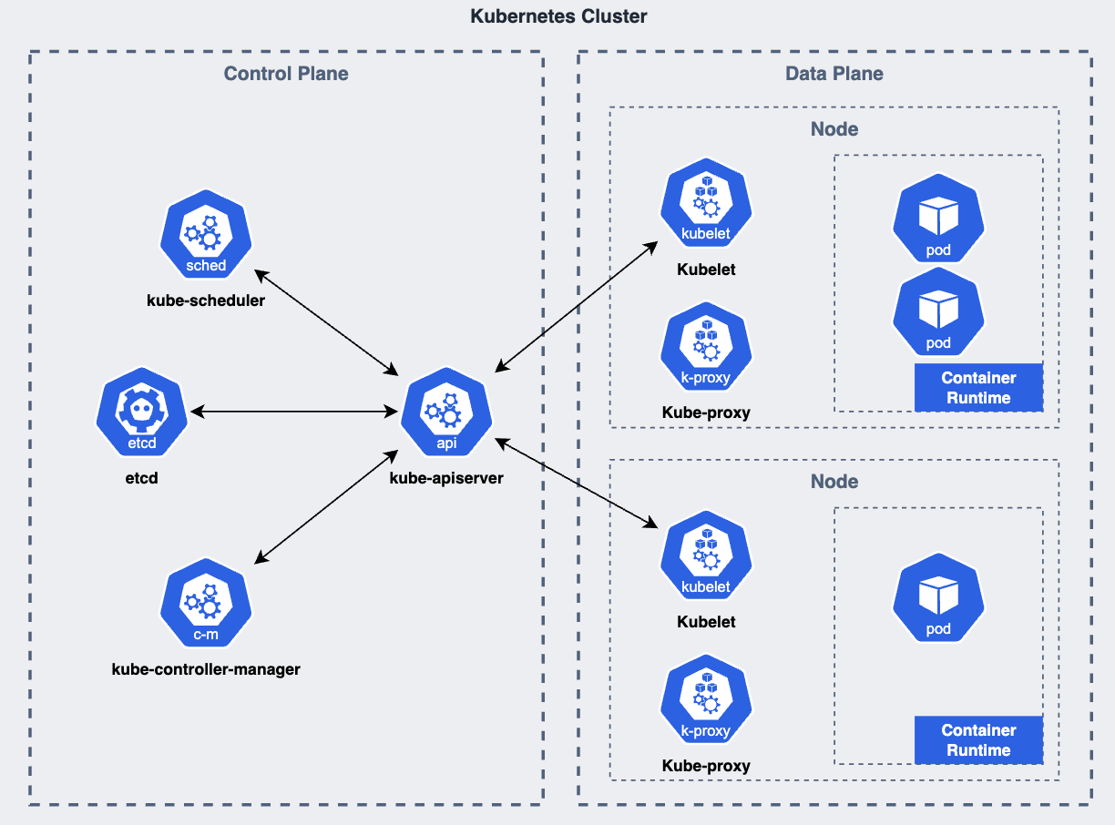 - Kubernetes는 Cluster의 상태를 관리하고 조정하는 Control Plane과 실제 컨테이너 애플리케이션이 실행되는 영역인 Data Plane(Worker Node)으로 구성됩니다.