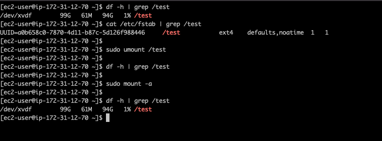 umount {mount-point}로 마운트 해제mount -a로 마운트 했을때 정상적으로 마운트가 된다면/etc/fstab반영 완료