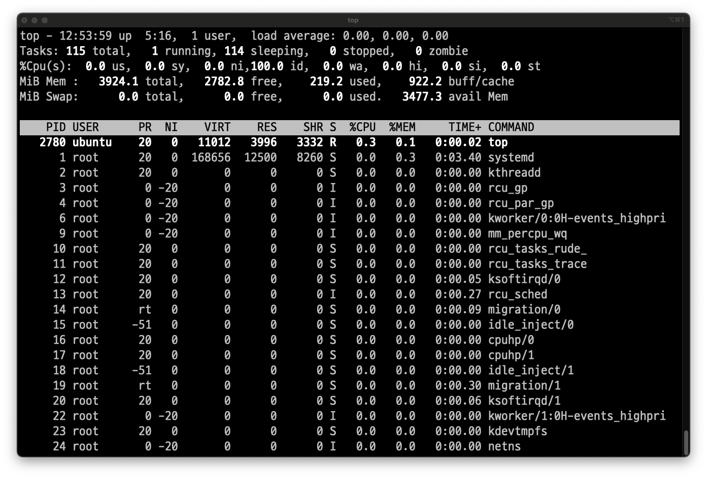 PID: ํ๋ก์ธ์ค ์์ด๋USER: ์ ์ ๋ค์PR: ์ค์ผ์ค๋ง ์ฐ์ ์์- rt : real time(์ค์๊ฐ) ์ค์ผ์ค๋ง