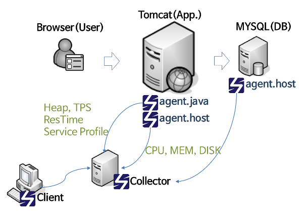 agent: ์ฑ๋ฅ ์ ๋ณด๋ฅผ ์์งํ๊ณ ์๋ฒ๋ก ์ ์กํ๋ ์ญํagent.host: ์๋ฒ์ ์ฑ๋ฅ์ ๋ณด(CPU, MEM, DISK)๋ฅผ ์์งํ๋์์ด์ ํธagent.java: JVM๊ณผ Web ์ ํ๋ฆฌ์ผ์ด์ ์ ์ฑ๋ฅ์ ๋ณด(Heap, TPS, Service)๋ฅผ ์์งํ๋ ์์ด์ ํธ