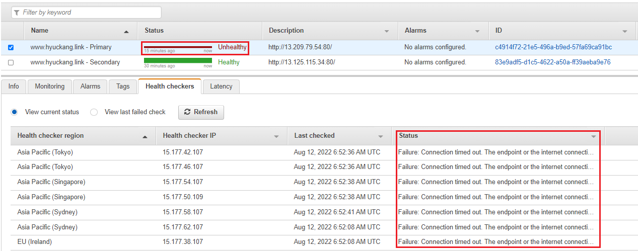 - Primary EC2를 정지시켰고 Primary Health Check가 Unhealthy로 변경되었습니다.
