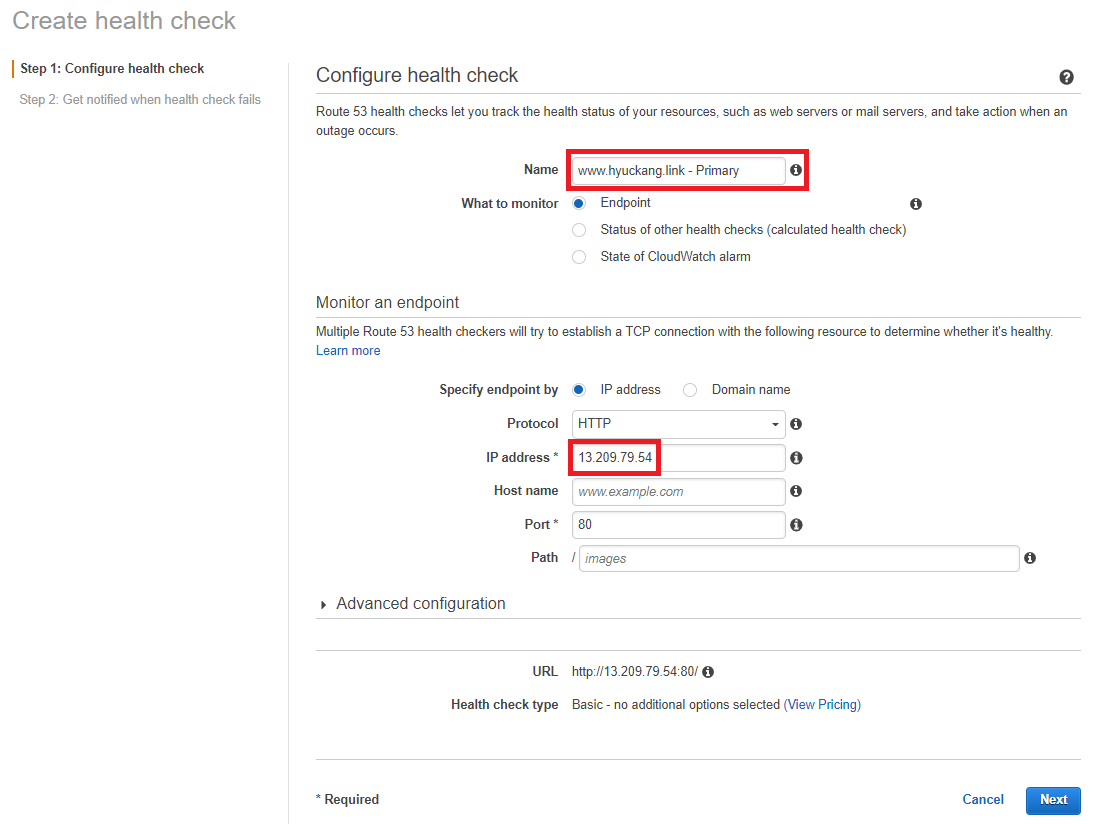 - 사진과 같이 Primary / Secondary 2개의 Health check를 구성합니다.
