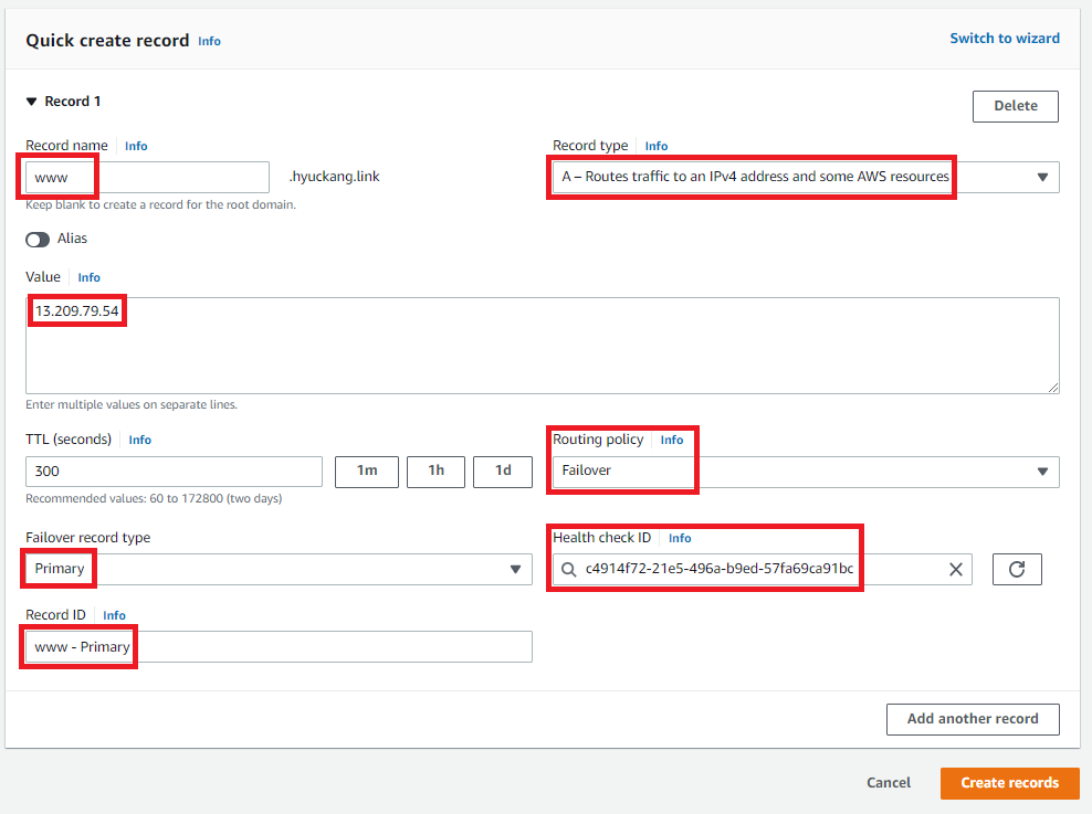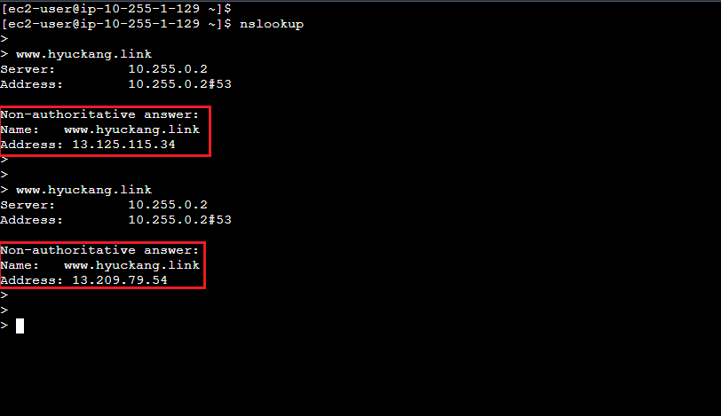 Primary / Secondary Health Check를 설정하고failover routing을 구성합니다.Primary health check가Unhealthy상태가 되면 DNS가 Secondary로failover되고,Healthy상태로 돌아오면 DNS가 Primary로failback됩니다. - 평상시에는 DNS Lookup이 Primary EC2로 되지만
